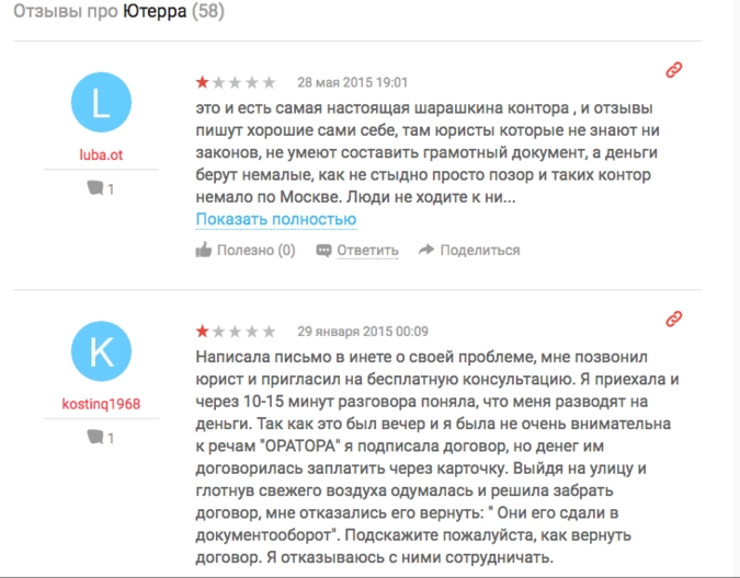 Так, представители компании «Ютера» бесплатно консультировали своего клиента 15 минут, успев за это время пообещать положительный исход процесса и выманить у него 40 тысяч рублей за готовность представлять его интересы в суде.