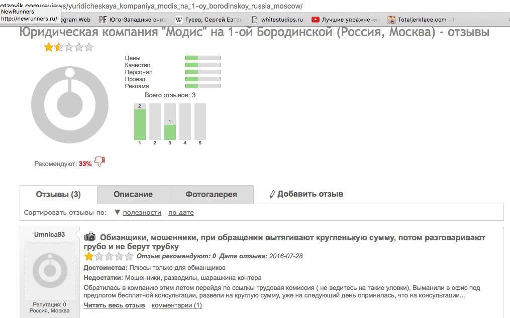 Позже наш корреспондент выяснил, что по указанному адресу располагается юридическая фирма «Модус». Отзывы в Сети об этой конторе оказались довольно критичными. Возможно, журналисту просто повезло, что не ободрали как липку.