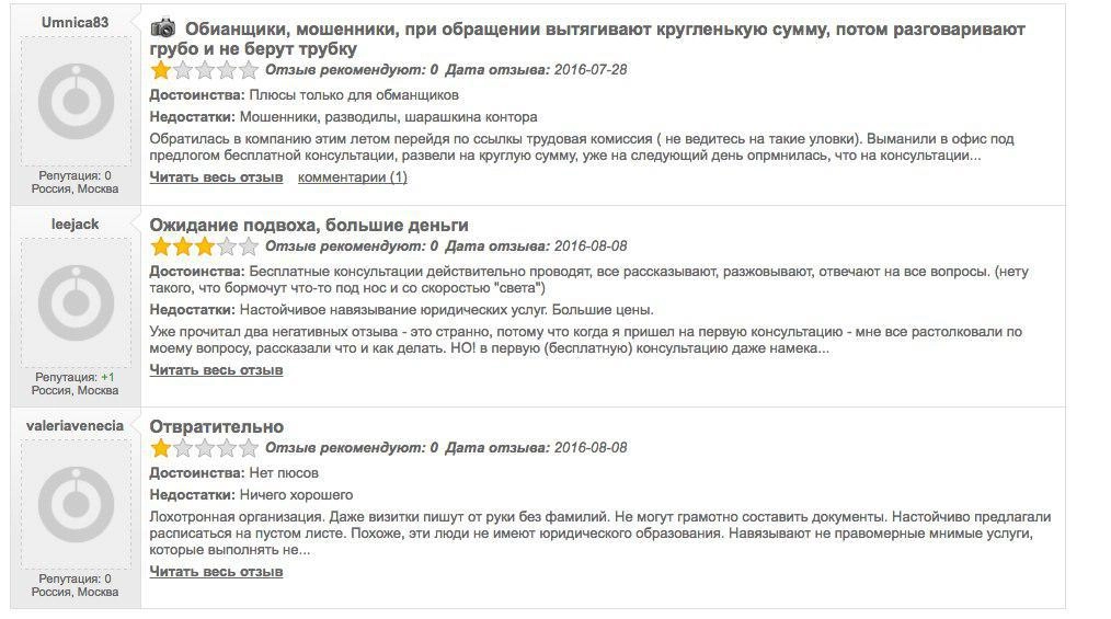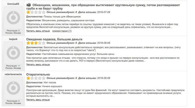 Ну а пока проблема лжеюристов не решена, гражданам перед походом стоит проверить фирму, которая обещает качественную (а особенно бесплатную) консультацию — читать отзывы о ее работе и не реагировать на уловки аферистов в стиле: «ваша ситуация очень тяжелая — только сегодня и только по специальной цене мы можем вас спасти».