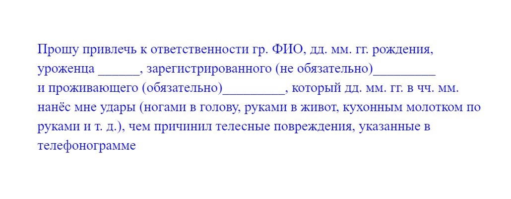 2. Кто избил. Не переживайте, если медик укажет только степень родства, это не важно. В телефонограмме (ТЛГ) указывается только: избит известным/неизвестным — это нормально.