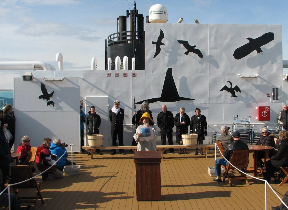 Позавчера утром у нас на борту был праздник Нептуна, где бородатый капитан Арийд Хайвик и бородатый Нептун поливали всех желающих холодной водой со льдом в честь пересечения Полярного круга.
