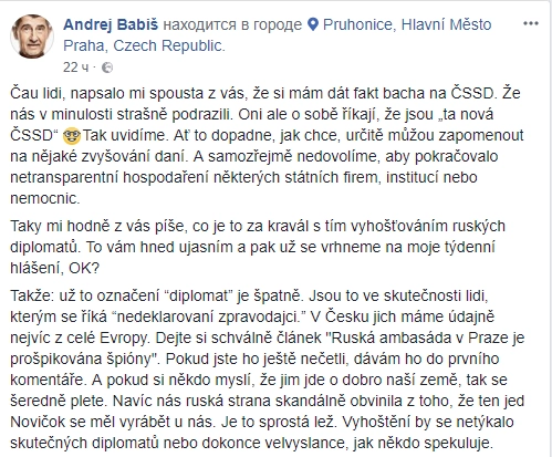 Ранее премьер Чехии Андрей Бабиш написал на свой странице в Facebook, что возможная высылка из Чехии в связи с «делом Скрипаля» коснется не дипломатов, а «незадекларированных разведчиков», работающих под дипломатическим прикрытием. По его словам, Прага лидирует по числу российских шпионов в Европе.