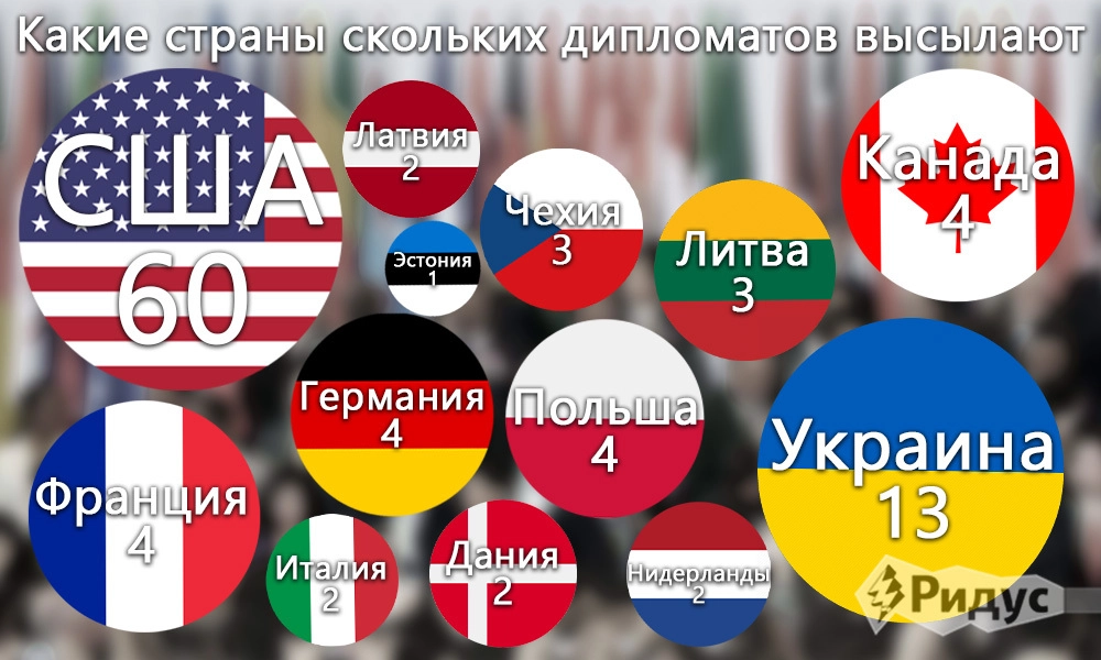 Украина вышлет 13 российских дипсотрудников. По четыре дипломата РФ должны будут покинуть Францию, Германию и Польшу, по три — Литву и Чехию, по два — Албанию, Данию, Испанию, Италию и Нидерланды. Латвия вышлет одного дипломата и сотрудника «Аэрофлота», Эстония — российского военного атташе. Также по одному российскому дипломату вышлют Венгрия, Норвегия, Румыния, Финляндия, Хорватия и Швеция.