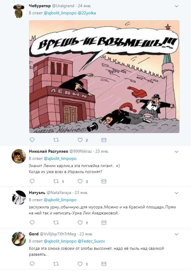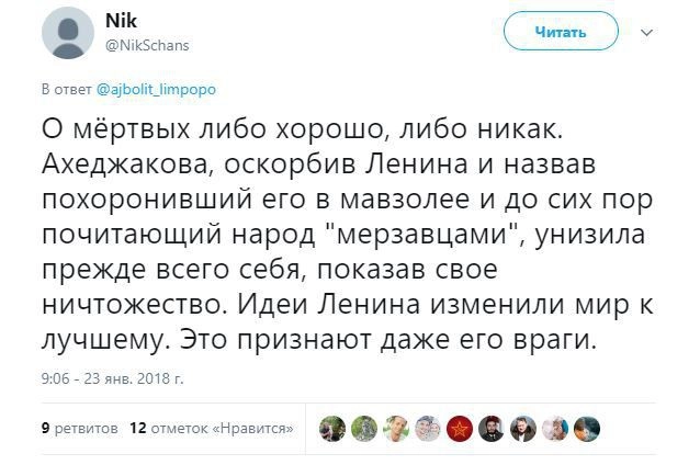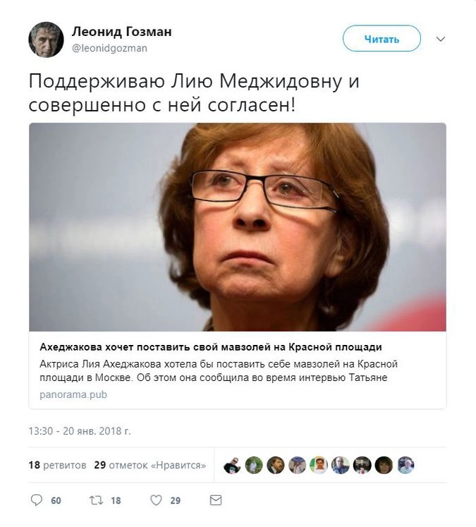 В Сети обсуждают приписываемое народной артистке РФ Лии Ахеджаковой высказывание о необходимости разрушить Мавзолей Ленина на Красной площади Москвы. Некое информагентство «Панорама» сообщило о том, что Ахеджакова якобы во время интервью Татьяне Фельгенгауэр на радио «Эхо Москвы» заявила следующее: