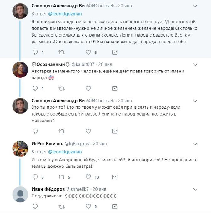 «Вот лежит там догнивает этот карлик. Пыль уже с него сыпется. Давно пора его оттуда вынести. Кроме коммунистов, никто не хочет его видеть в мавзолее. Да и сам мавзолей пора разрушить. А то, что хотят всякие мерзавцы, не имеет значения. Я вот тоже хочу свой мавзолей на Красной площади, да и люди меня любят больше, чем Ленина, но разве сегодня мне позволят его поставить?»