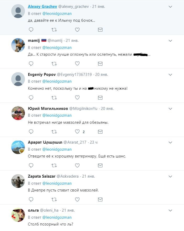 «Какие сволочи! Это все время! У меня же три ложных „Твиттера“! У меня есть адвокат, который с ними борется. Какой ужас! И кто, вы думаете, это делает? Эти, ольгинские? Что же мне теперь делать? Я считаю, что это уголовное дело. И это не первый случай, ужасно… Это убивает человека, понимаете? Чтобы на меня напали какие-нибудь, чтобы мне машину подожгли, вот для чего это делается. Какие изверги, а?!» — сказала она.