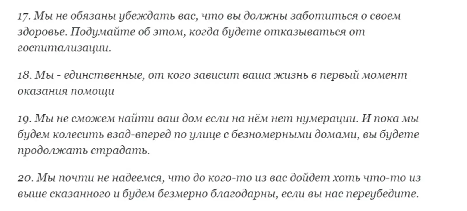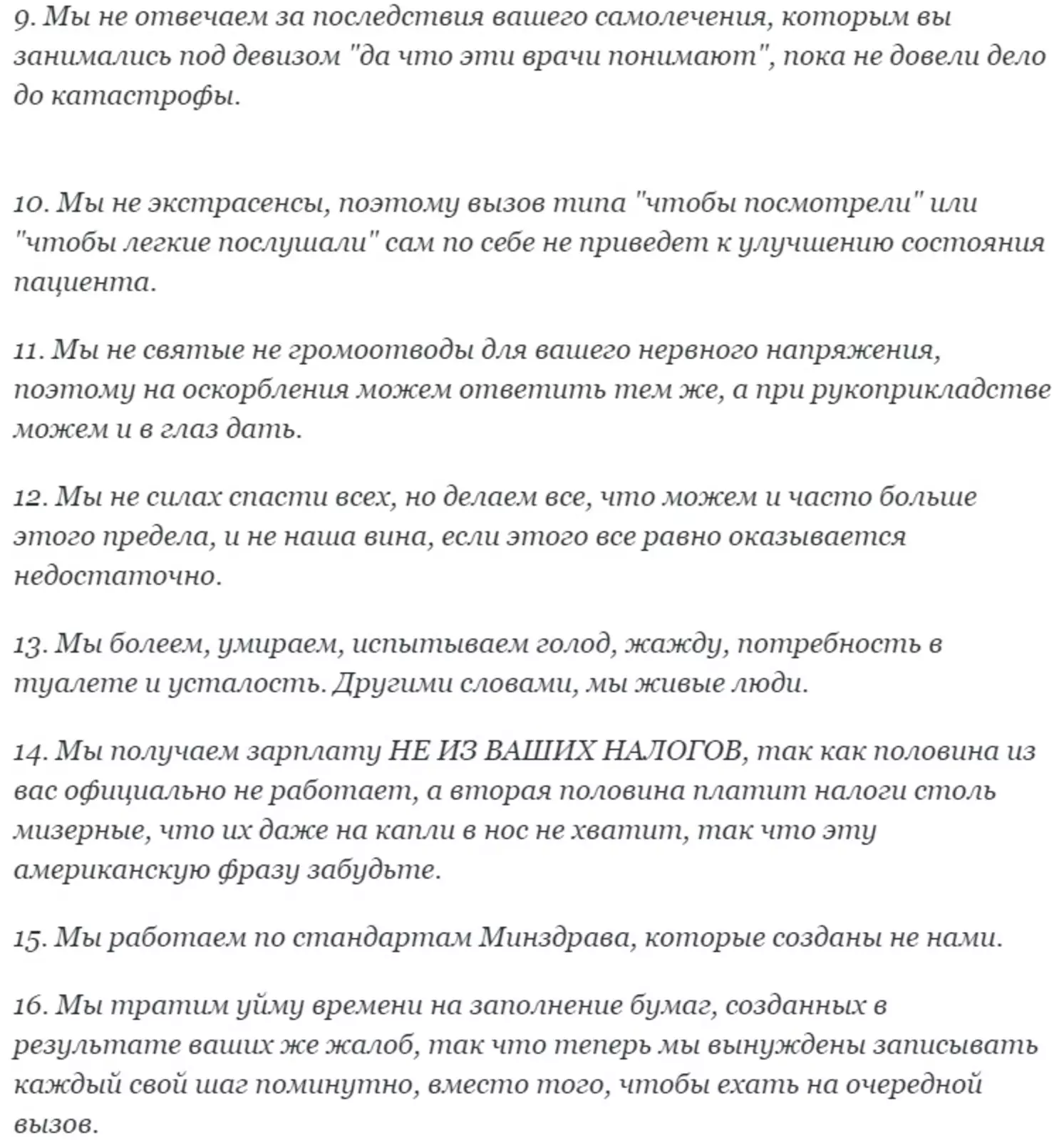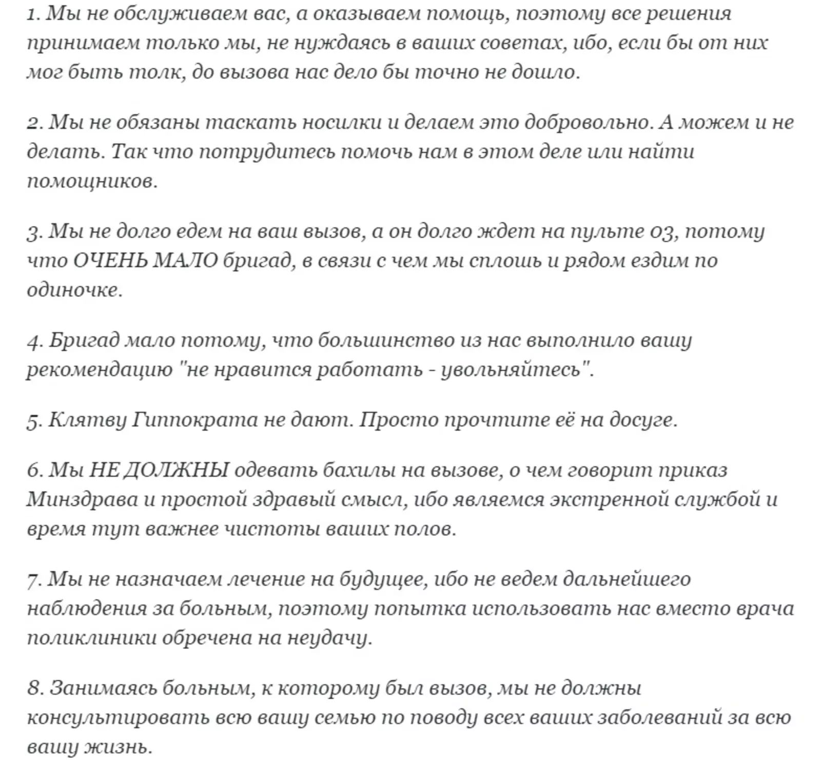 Пользователи Рунета ознакомились с документом под названием «Кодекс работника скорой помощи», в котором сотрудники службы высказали, чем более всего недовольны в своей работе и поведении пациентов.