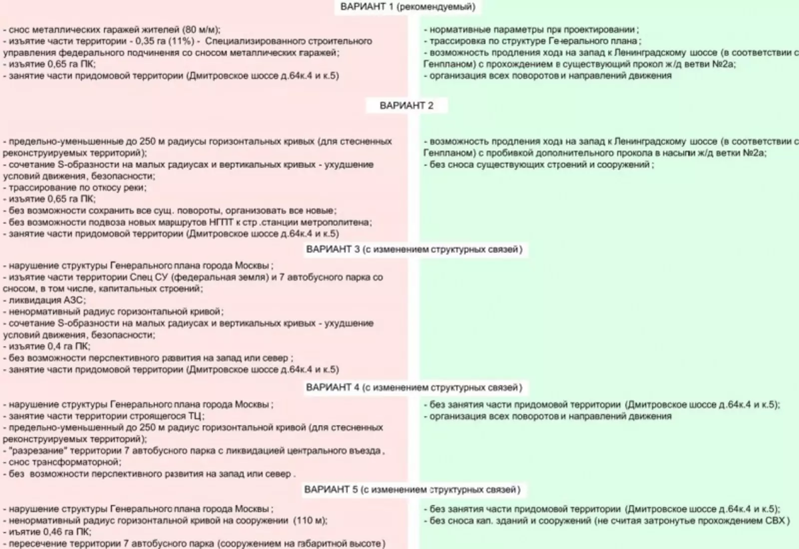 Отмечу, что уже в названии проекта планировки есть ошибка — путепровод не будет соединять две часть Проектируемого проезда № 2236, а будет сооружён для пропуска железнодорожных путей через него. Далее в том же документе есть варианты трассировки эстакады через Дмитровское шоссе (2-ая очередь строительства) со сравнением особенностей каждого из вариантов: