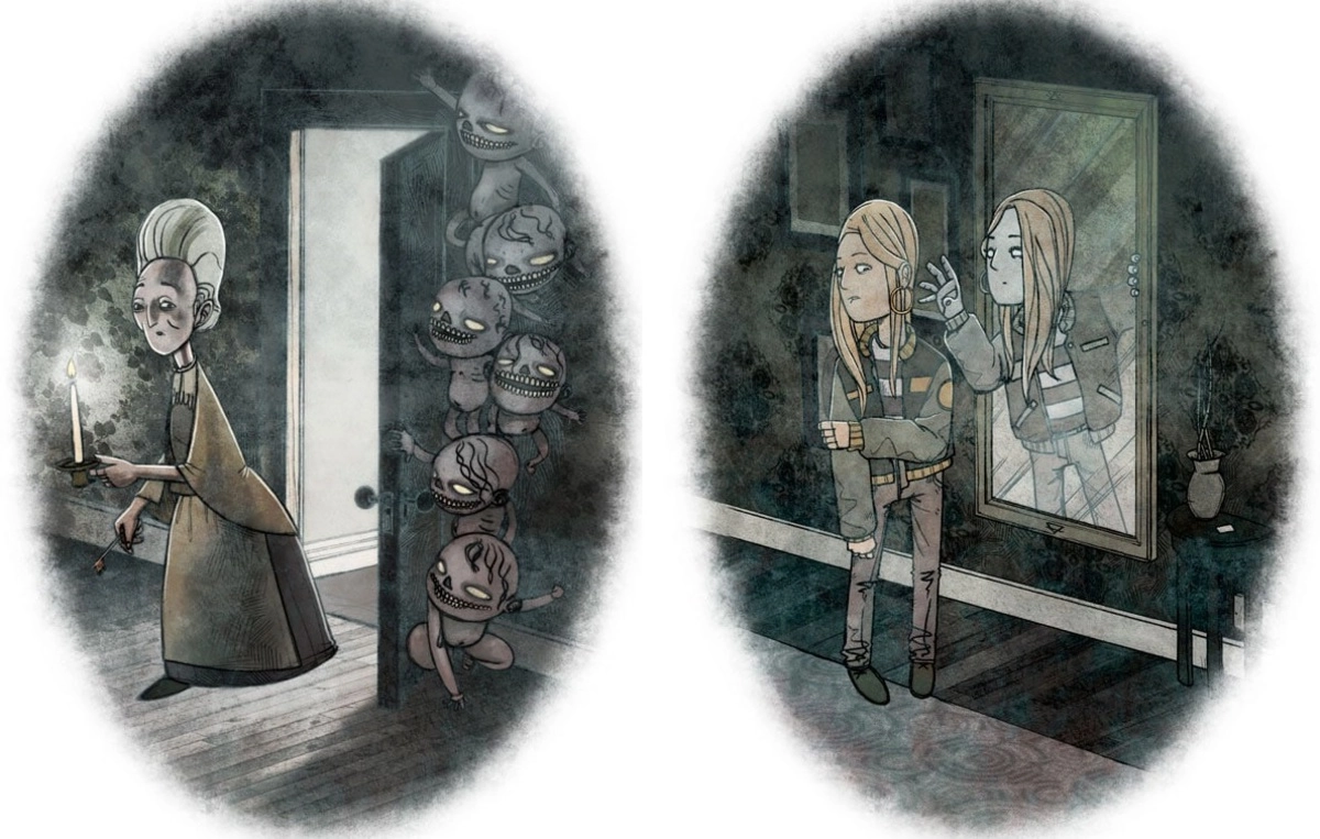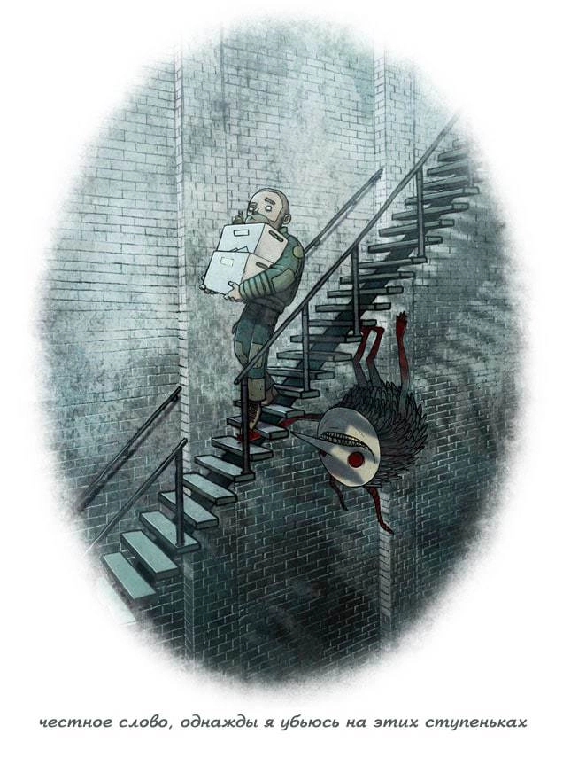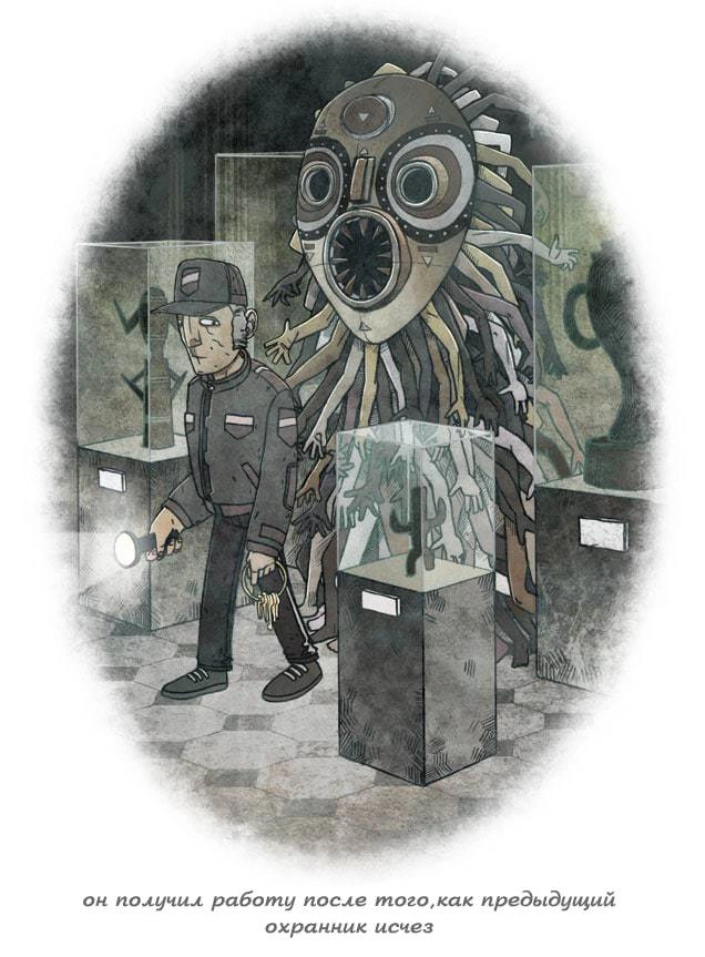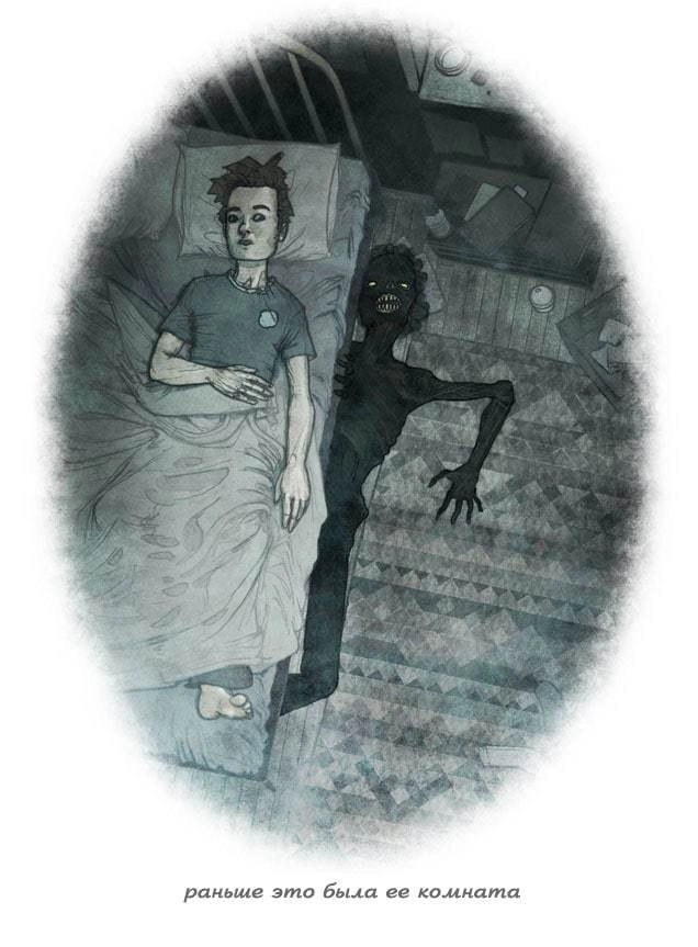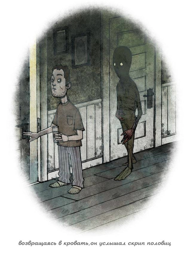 Эти жуткие образы зарисовывает художник Брайан Колдрик, целую серию пугающих комиксов он так и назвал «За твоей спиной» («Behind you«). На русский язык их переводит блогерша Анастасия Скрыпник и выкладывает картинки в сообществе Вконтакте