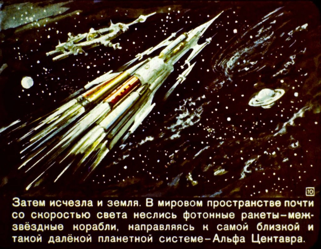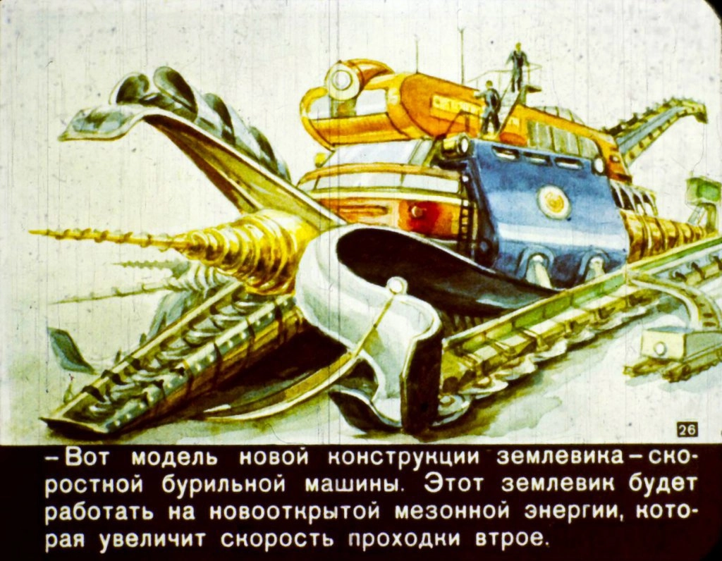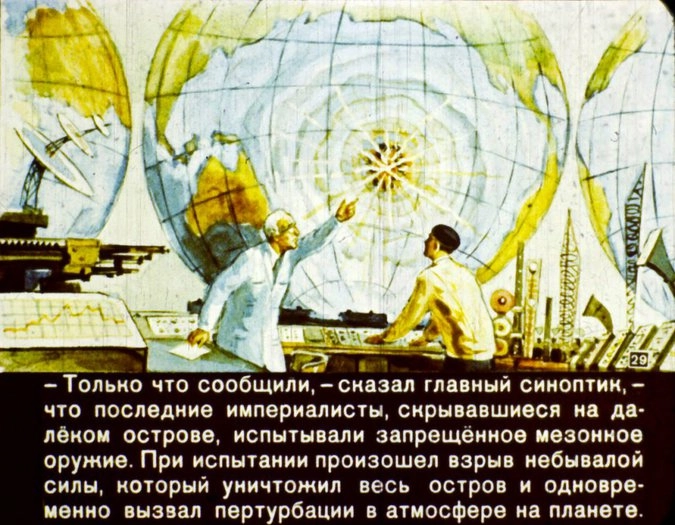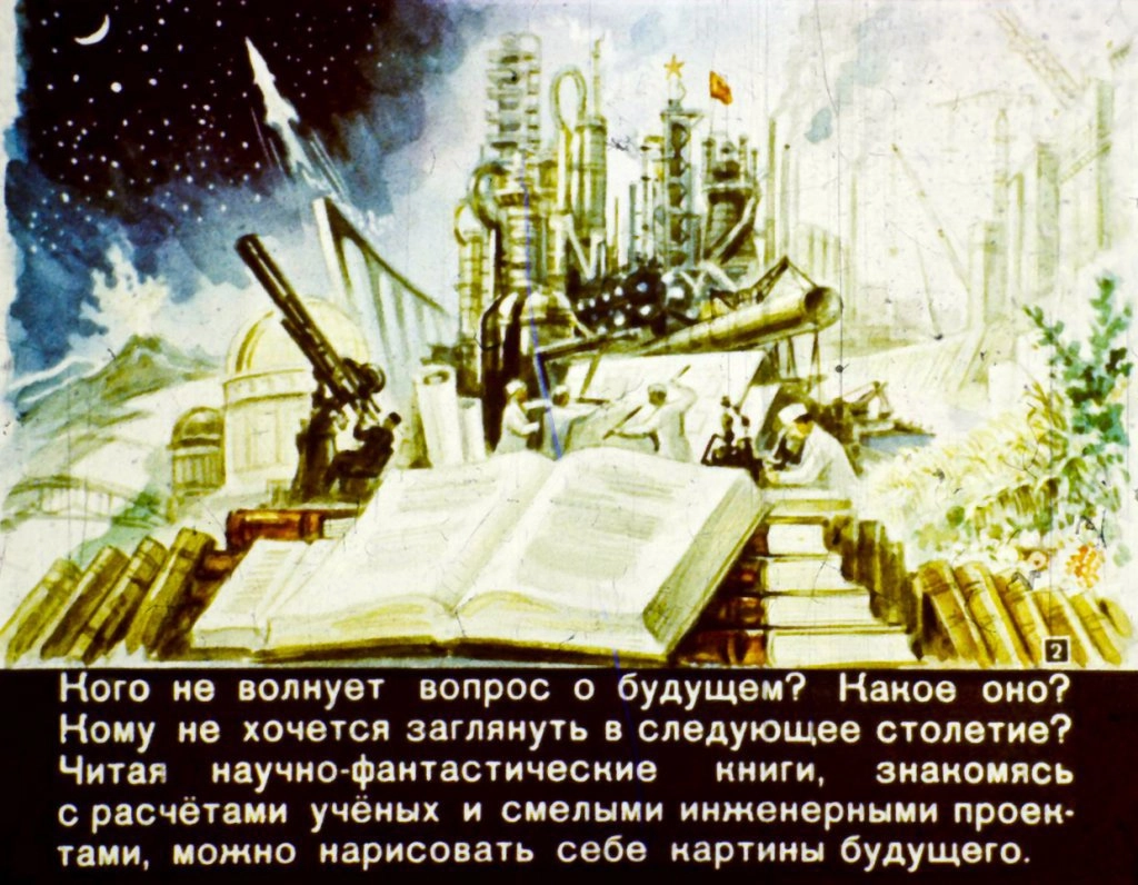 Диафильм был предназначен для школьников, и с точки зрения авторов, в далеком советском будущем (коммунизм, как известно, планировали построить к 2000 году) должны были ездить атомные поезда, звонить телевидеофоны, а империалисты в это время испытывают запрещённое «мезонное оружие».