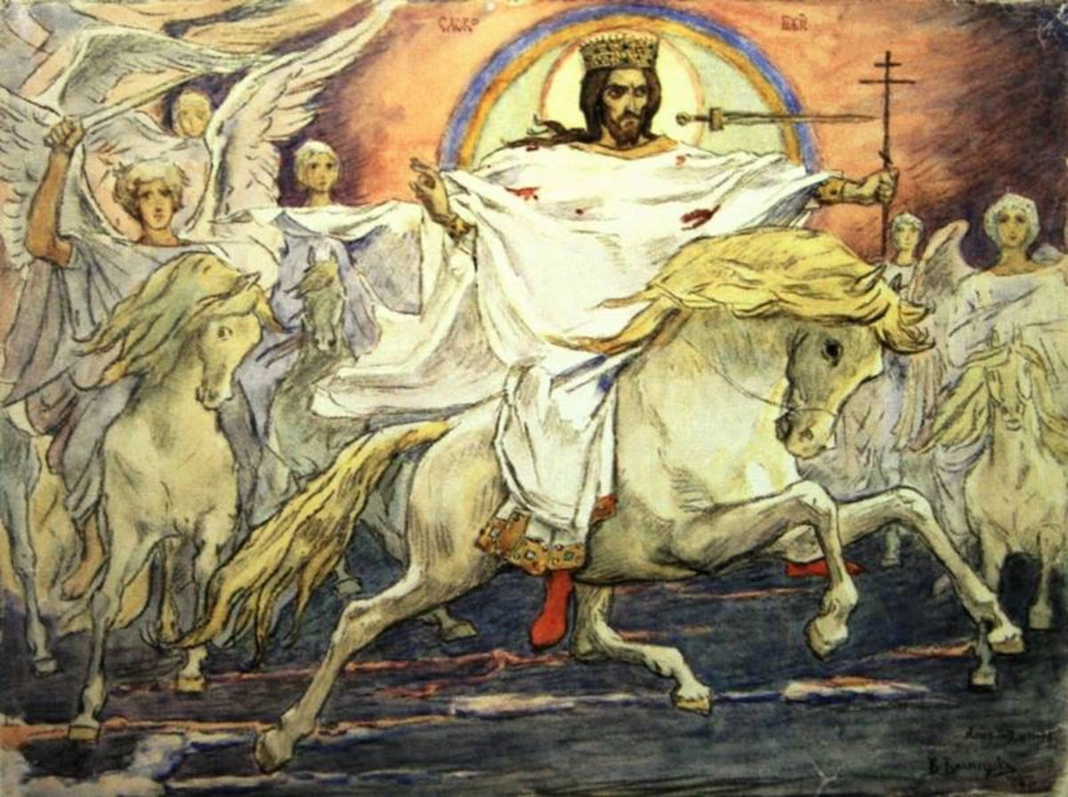 Всадник на белом коне -- это явление грозного Христа в образе Мессии. Дальнейшее описание сплошь основано на ветхозаветных словосочетаниях и пророчествах.