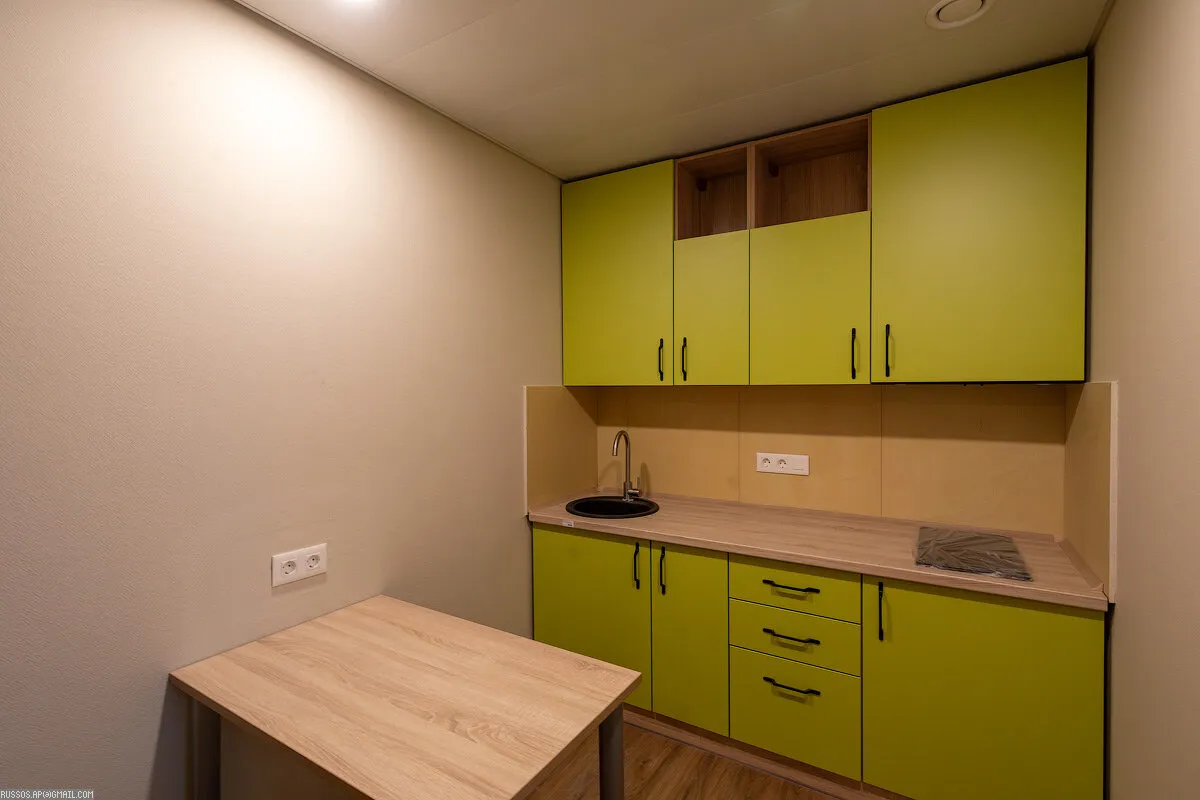 7. На каждый блок есть своя кухня с холодильником, плитой и микроволновкой.