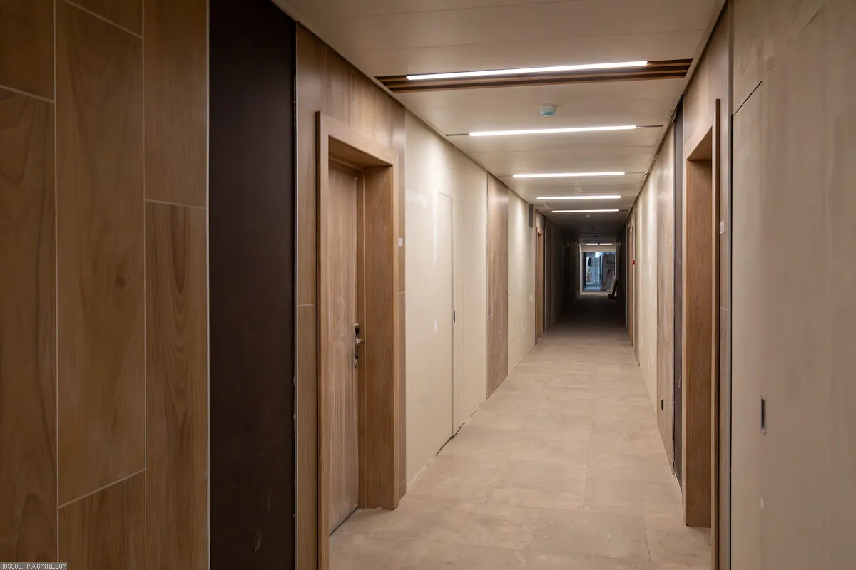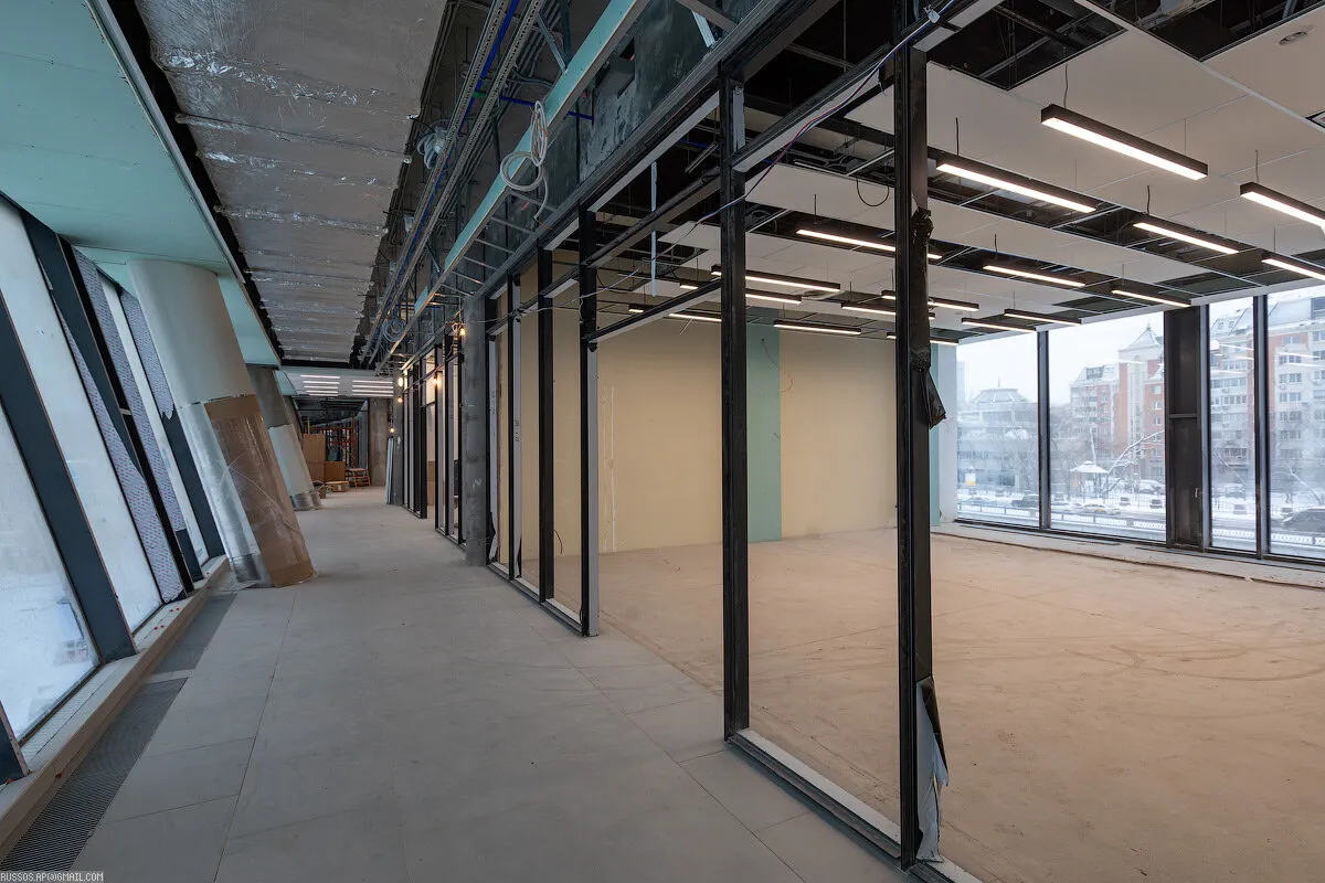 Второй корпус высотой 29 этажей и площадью более 43 тыс. кв. метров, здесь продолжаются фасадные работы, они будут полностью завершены в текущем году. На нежилых этажах полностью завершена черновая отделка, идут чистовые отделочные работы в жилом пространстве.