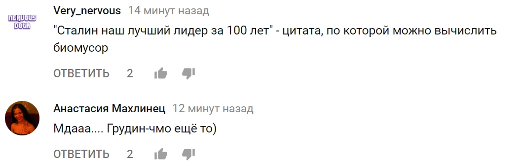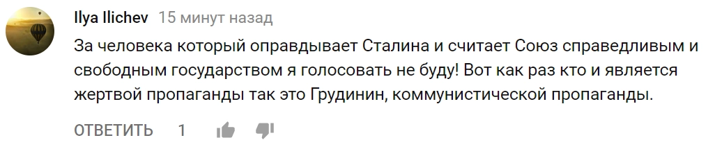 Эти противоречивые высказывания предпринимателя ввели обитателей Рунета в замешательство: слова Грудинина о Сталине возмутили пользователей всех политических взглядов. Первые негативные отклики на заявления Грудинина возникли в секции комментариев к ролику на YouTube:
