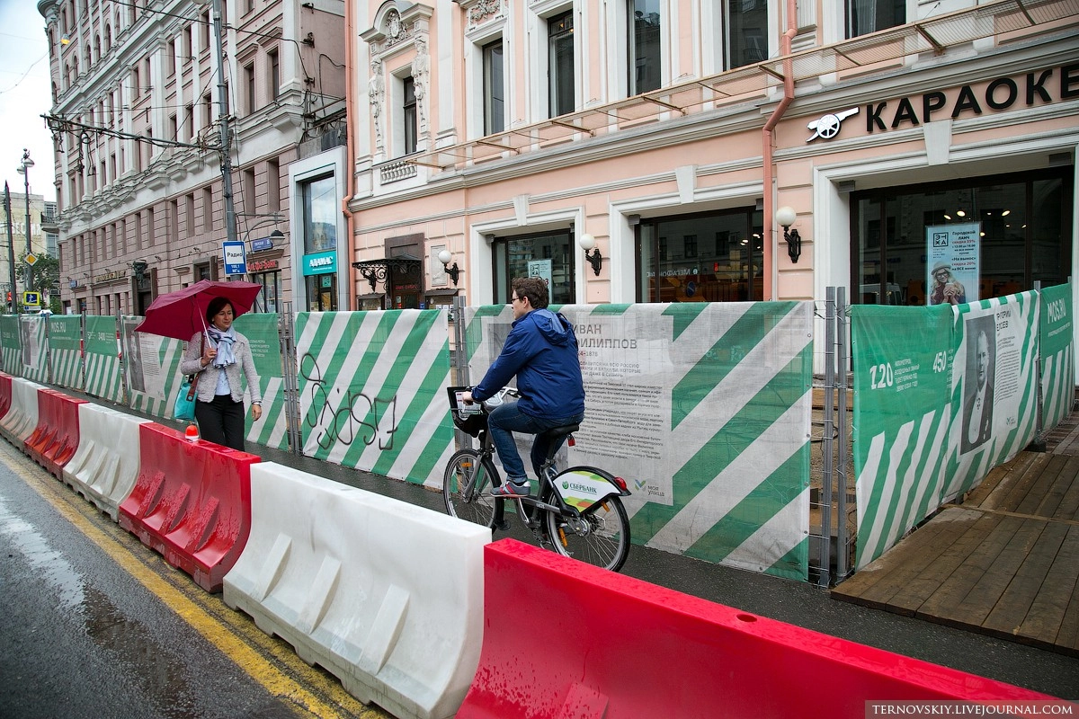Для пешеходов и велосипедистов были организованы удобные пути движения по улице во время перекрытия. Деревянные настилы, безопасные короба для проводов, оформление стройки в едином стиле, подходы к магазинам и кафе.