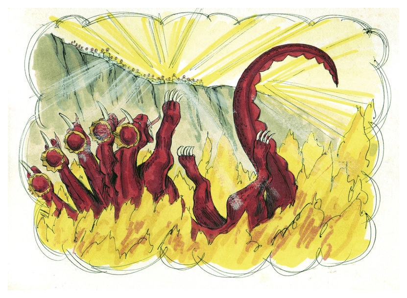 И вот мы увидим «Дюне» упоминание того самого Зверя из моря, которое вдохновит столь многих фантастов. Ведь это удивительное чудовище: оно обладает огромной властью над умами, ему поклонятся цари земные, оно умеет сеять смерть. А еще у него потрясающий облик, если верить «Апокалипсису»: Зверь, которого я видел, был подобен барсу; ноги у него — как у медведя, а пасть у него — как пасть у льва (Откр. 13:2), то есть он мутант, химера. А поскольку он жил в море, художники придавали ему и всякие морские черты.