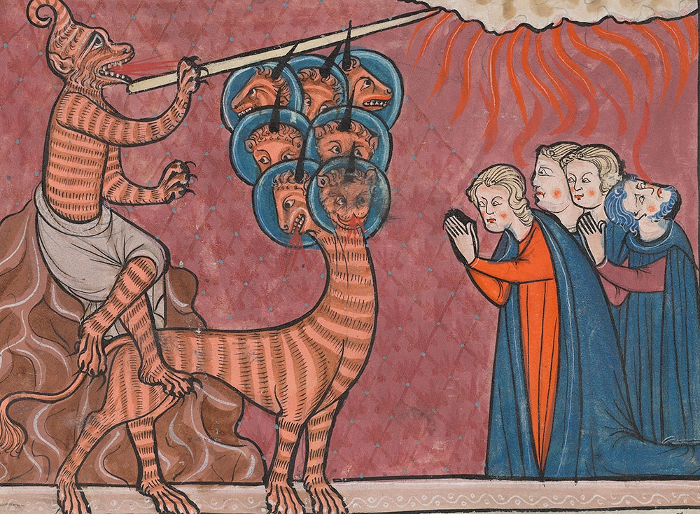 Нечистые духи (в виде жаб) выходят изо ртов трех Зверей Апокалипсиса. Миниатюра из «Тринити Апокалипсиса», 13-й век