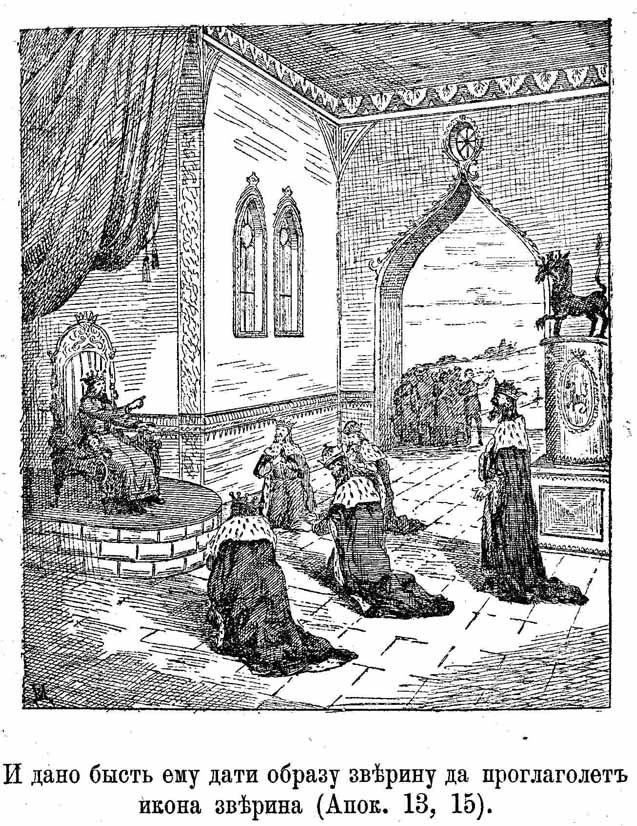 А потом появляется третий зверь — Зверь из земли. Он похож на агнца, а вы же помните, что Агнец — это Иисус Христос, то есть этот зверь притворяется им. В следующих строчках его прямо называют лжепророком, а рисуют Зверя из земли, в отличие от двух предыдущих, уже человекоподобным. Ну, по крайней мере, носящим человеческую одежду (рясу). Он — Антихрист. Он является темной копией Мессии, Иисуса Христа, созданной, чтобы вводить слабых людей в заблуждение.