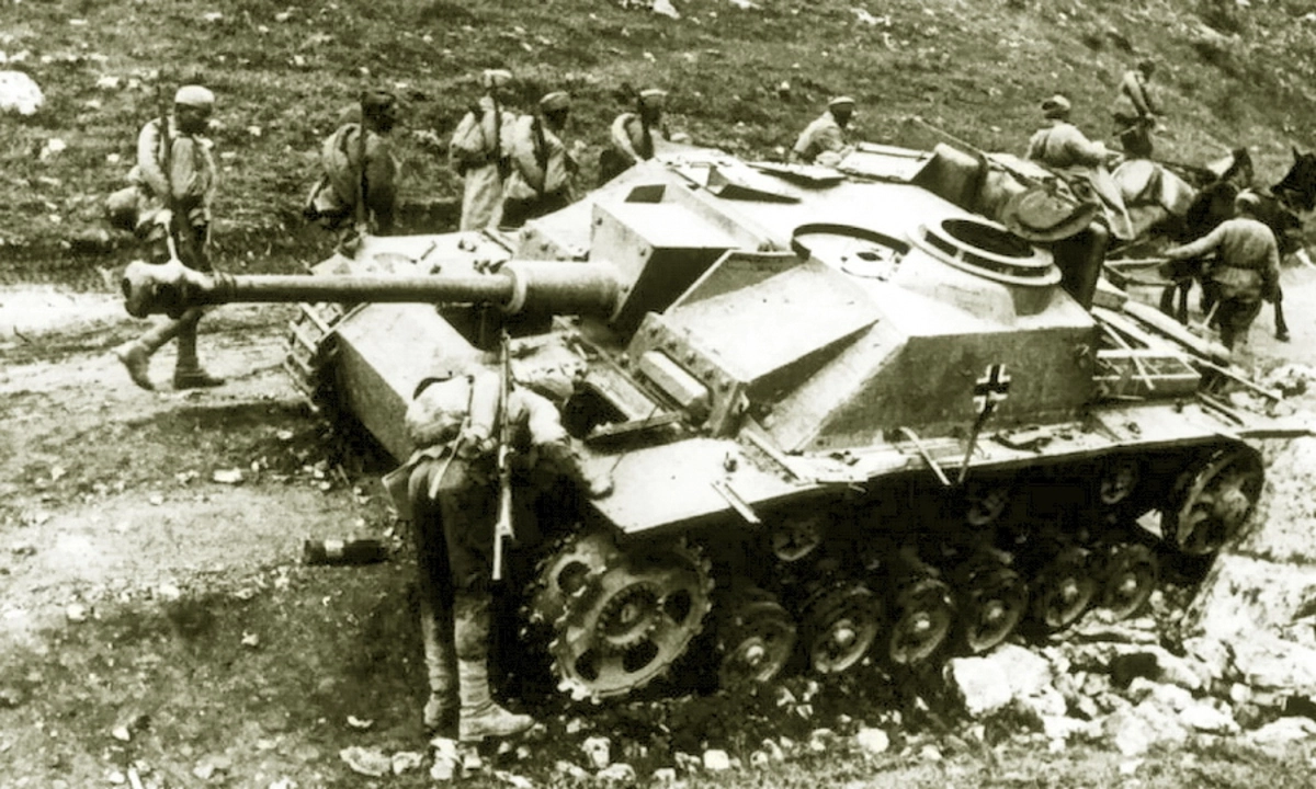 Красноармейцы проходят мимо подбитой и брошенной у дороги немецкой самоходки StuG 40. Крым, весна 1944 года