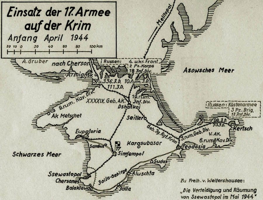 Поэтому немецкий солдат весной 1944 года всё ещё оставался в Крыму, с тревогой поглядывая то на север, где с недобрыми для XLIX горнострелкового корпуса генерала горных войск Рудольфа Конрада (Rudolf Konrad) намерениями группировались части 2-й гвардейской армии генерал-полковника Г.Ф. Захарова и 51-й армии генерал-лейтенанта Я.Г. Крейзера, то на восток, где с осени 1943 года Отдельная Приморская армия генерала армии А.И. Еременко расшатывала оборону V армейского корпуса генерала инфантерии Карла Альмендингера (Karl Allmendinger).