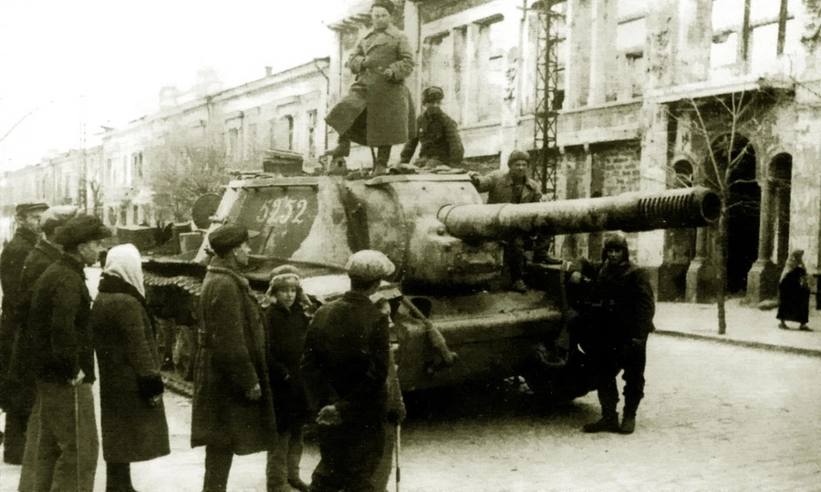 СУ-152 1452-го тяжёлого самоходно-артиллерийского полка в освобождённом Симферополе, апрель 1944 года
