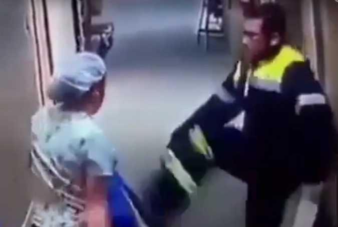 На пару секунд врач оставляет беременную коллегу в покое, но после того, как она берет в руки две большие сумки, с силой бьет ее ногой в живот. На кадрах запечатлен момент, как женщина сгибается пополам от боли.