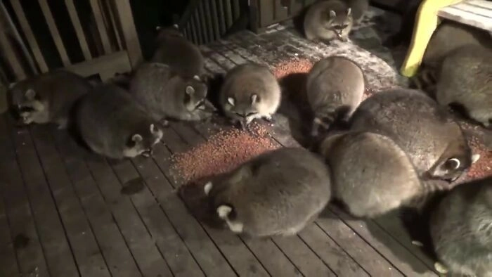 Для енотов их двуногий «папа» — настоящий подарок. Он каждый день кормит их вкусностями, лечит и помогает спасаться от насекомых и паразитов. Мужчина живет в довольно уединённой зоне, где очень мало людей, поэтому он не опасается, что еноты будут беспокоить соседей. Кроме того, судя по их довольному и упитанному виду, им совершенно незачем воровать у соседей или лазить по помойкам. Ведь Джеймс прекрасно обеспечивает их всем необходимым.