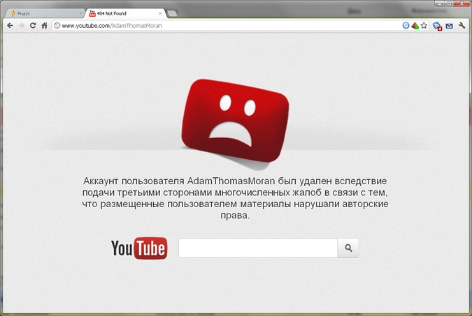 «Аккаунт пользователя AdamThomasMoran был удален вследствие подачи третьими сторонами многочисленных жалоб в связи с тем, что размещенные пользователем материалы нарушали авторские права», - указано на странице, где раньше находился видеоканал.
