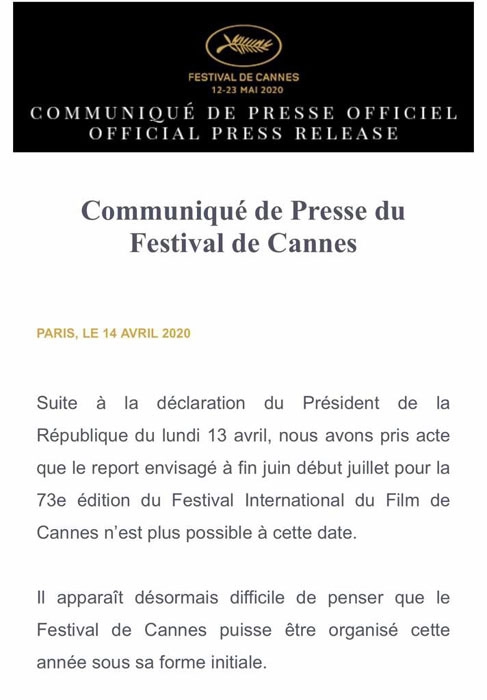 Фестиваль с 1952 года в мае проходит на юге Франции. В середине марта организаторы отложили его проведение на неопределенный срок из-за COVID-19. Тогда они допускали открытие кинофорума летом.