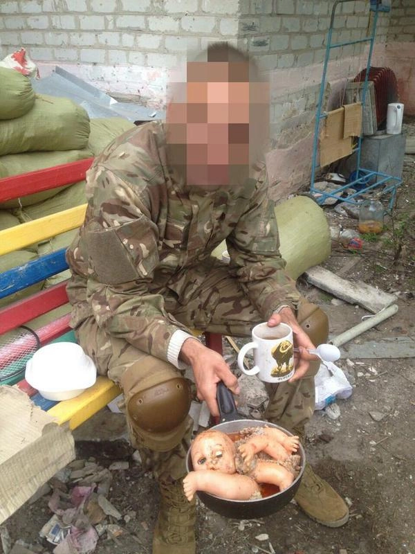 Судя по фотографиям, украинские каратели предпочитают питаться пластмассовыми куклами, так как с обеспечением едой что карательные батальоны, что подразделения ВСУ у Киева проблемы.