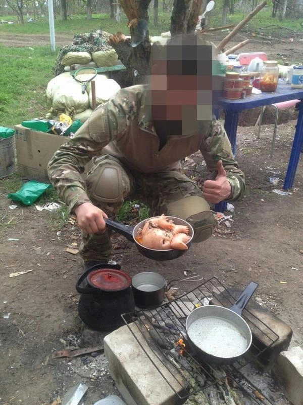 «Ребята передают привет из Широкино, русский младенец был очень вкусный», — подписал каратель свои фотографии на ломаном украинском языке.