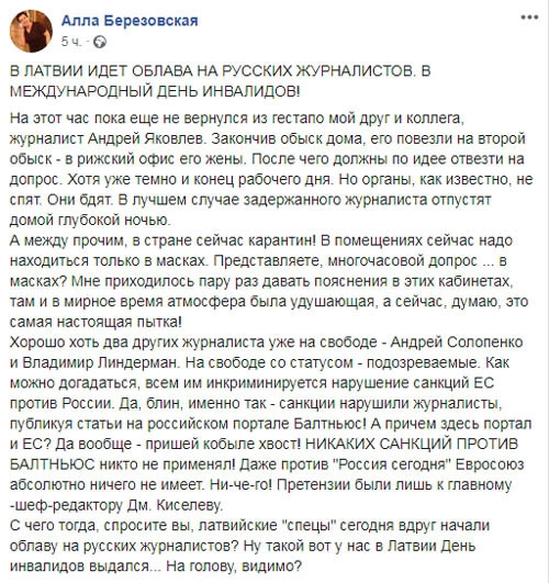 «В Латвии идет облава на русских журналистов», — написала она в своем сообщении.