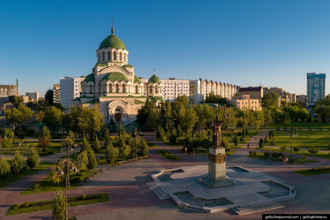 31. Собор Святого Владимира — один из главных храмов Астрахани. Его строительство закончилось в 1902 году. В советское время в здании открыли автовокзал. В конце 1990-х годов он передан церкви после реконструкции. Скульптура перед собором — святой князь Владимир.
