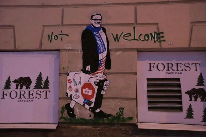 Жители Петербурга встречают лидера партии ПАРНАС Михаила Касьянова. Неизвестные художники разместили на стене дома на Набережной реки Фонтанки граффити, где экс-премьер России изображен с чемоданом в руках и шарфе с надписью «Страсбург», которая недвусмысленно намекает на его недавнюю встречу с Мустафой Джемилевым. Тогда, напомним, политик пообещал бывшему главе крымско-татарского меджлиса вернуть Крым под юрисдикцию Украины.