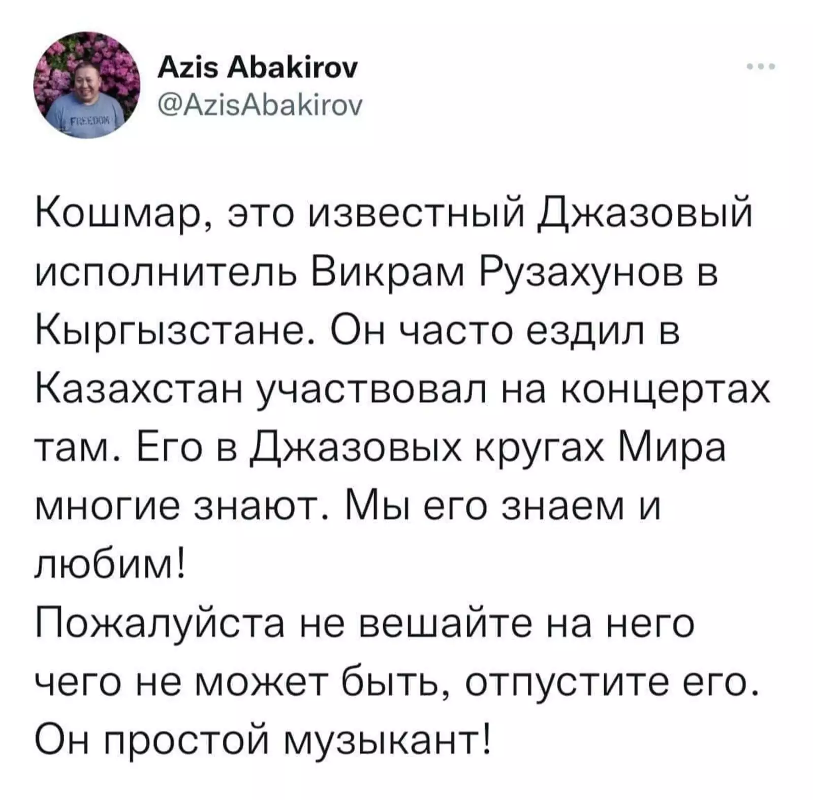 Телевидение Казахстана показало кадры допроса одного из задержанных участников уличных протестов в Алма-Ате. Задержанный признался, что он прилетел в Казахстан из Киргизии, чтобы участвовать в акции протеста за 90 тысяч тенге. Тем временем знакомые задержанного заявили о том, что «демонстрантом-наемником» является известный в Киргизии джазовый музыкант, организатор крупного международного музыкального фестиваля «Бишкек-джаз-весна» Викрам Рузахунов.