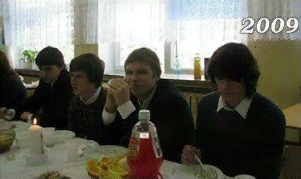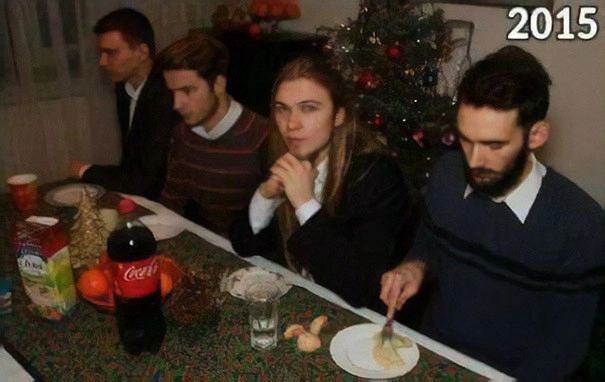 Новый год и Рождество — самая прекрасная пора для встречи с семьей и друзьями, а по ежегодным фотографиям можно легко отследить, как меняются люди с течением времени. Четыре друга восприняли эту классическую традицию буквально. И теперь каждый год не просто делают совместный праздничный портрет, но и воссоздают позы, выражения лиц и детали снимка. Оцените их усилия.