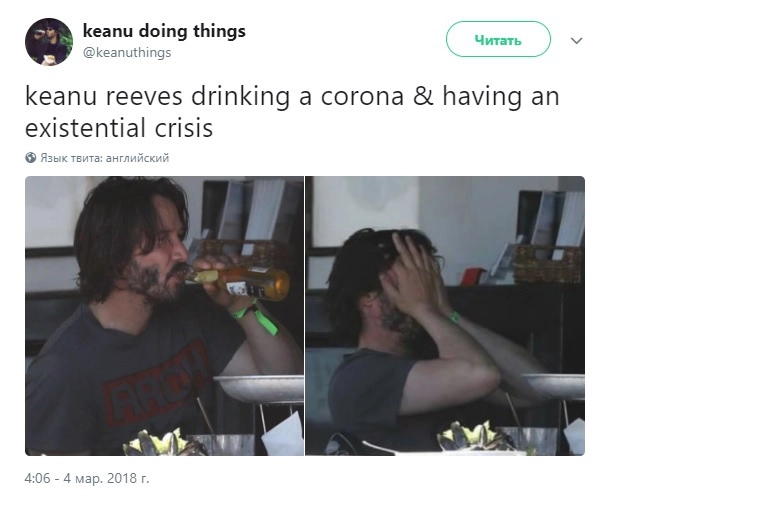 В 2010 году Ривз даже стал героем интернет-мема «грустный Киану». На фотографии, которую сделали папарацци, он сидел с удрученным видом, ел сэндвич и кормил птиц.