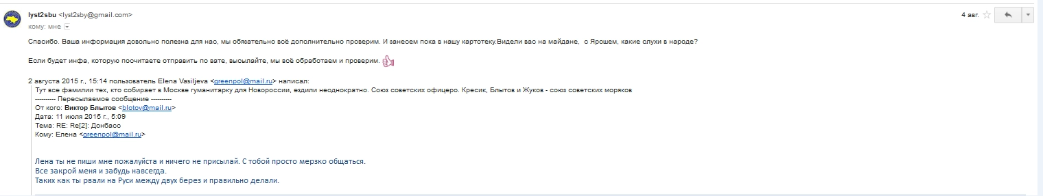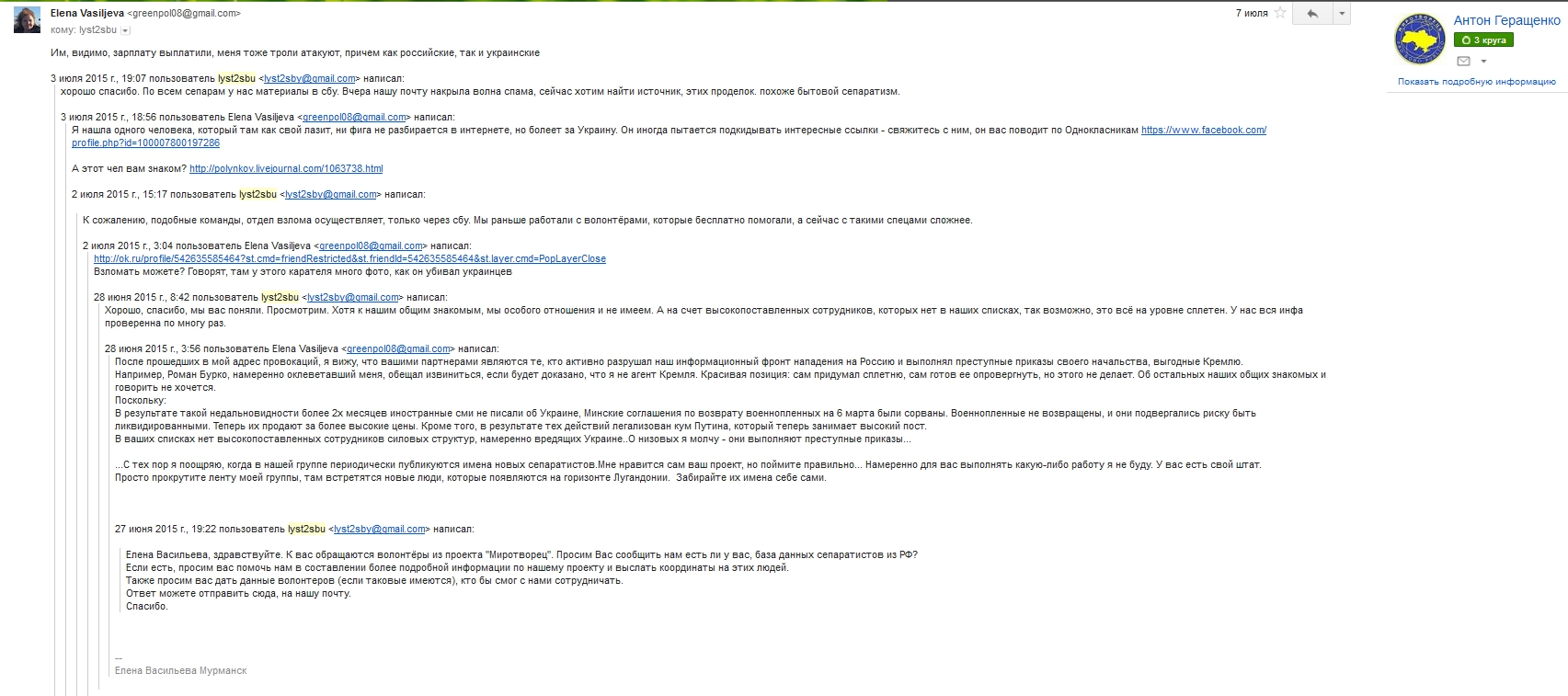 Хакеры, исследовав переписку Геращенко, утверждают, что «Васильева сливает нардепу информацию о российских гражданах на один из его почтовых ящиков lyst2sbu, которая позже попадает в Службу безопасности Украины».