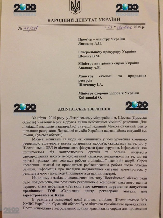 «Было завезено 140 тонн гептила и 500 тон пестицидов. Все это смешивалось именно на базе этого предприятия. И вывозилось на территорию Шостки и Шосткиснского района. Гептил опасен тем, что обладает кумулятивным свойством, имеет свойство накапливаться в организме», — рассказал журналистам руководитель экологических программ общественной организации «Розбудова» Максим Бродецкий.