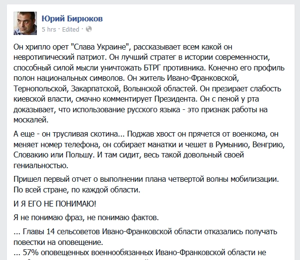 Украинские власти считают, что в срыве мобилизации виновато население западных районов страны. Подобное заявление на своей странице в Facebook сделал советник президента Украины Юрий Бирюков. Позже сообщение было удалено, однако сохранилось в кэше поисковиков.