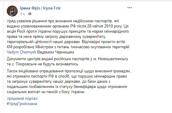«Инициирована обработка предложения о внесении граждан, получивших паспорта РФ способом, нарушающим международное право и угрожающим суверенитету нашего государства, в базу данных с последующим лишением их статуса бенефициара на получение социальных выплат или пенсий со стороны Украины», — пишет чиновник.