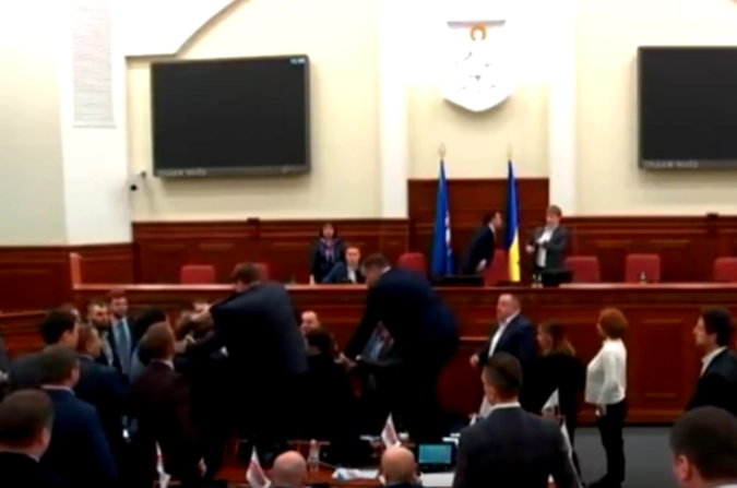 В Сети появилась видеозапись драки двух франций на пленарном заседании Киевского городского совета — пропрезидентской «ББП Солидарности» и националистической «Свободы». Конфликт был спровоцирован «свободовцем» Юрием Левченко, который в резких выражениях потребовал отставки мэра Виталия Кличко.