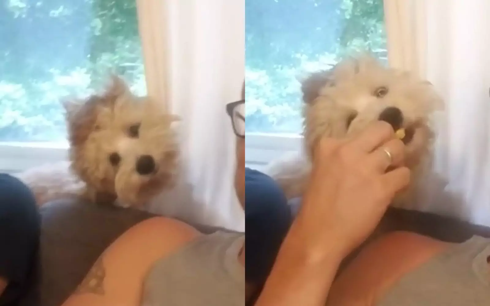 Руби никогда не выпрашивает попкорн, а ждет момента, когда кто-нибудь предложит его ей, что и сделал ее хозяин. Парень сказал: «Попкорн!», — и мордашка собаки сразу же выглянула из-за занавески. «Клади в рот, давай-давай», — говорил хитрый взгляд лохматой любительницы воздушной кукурузы.