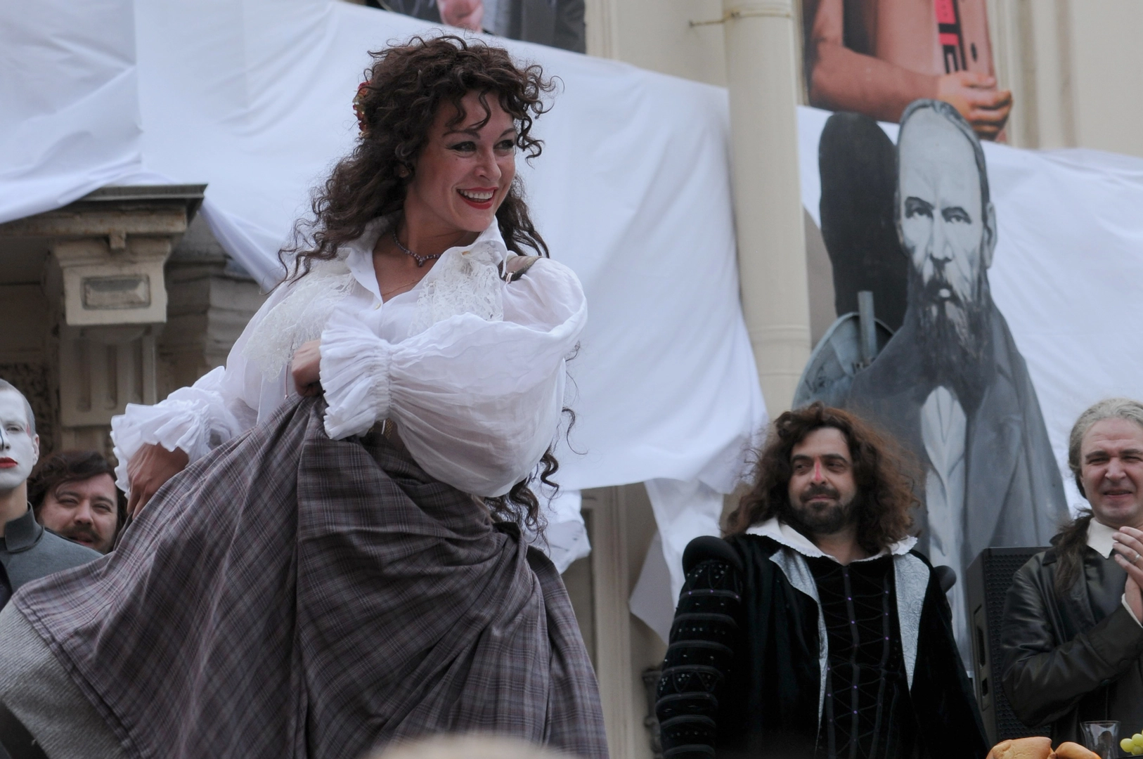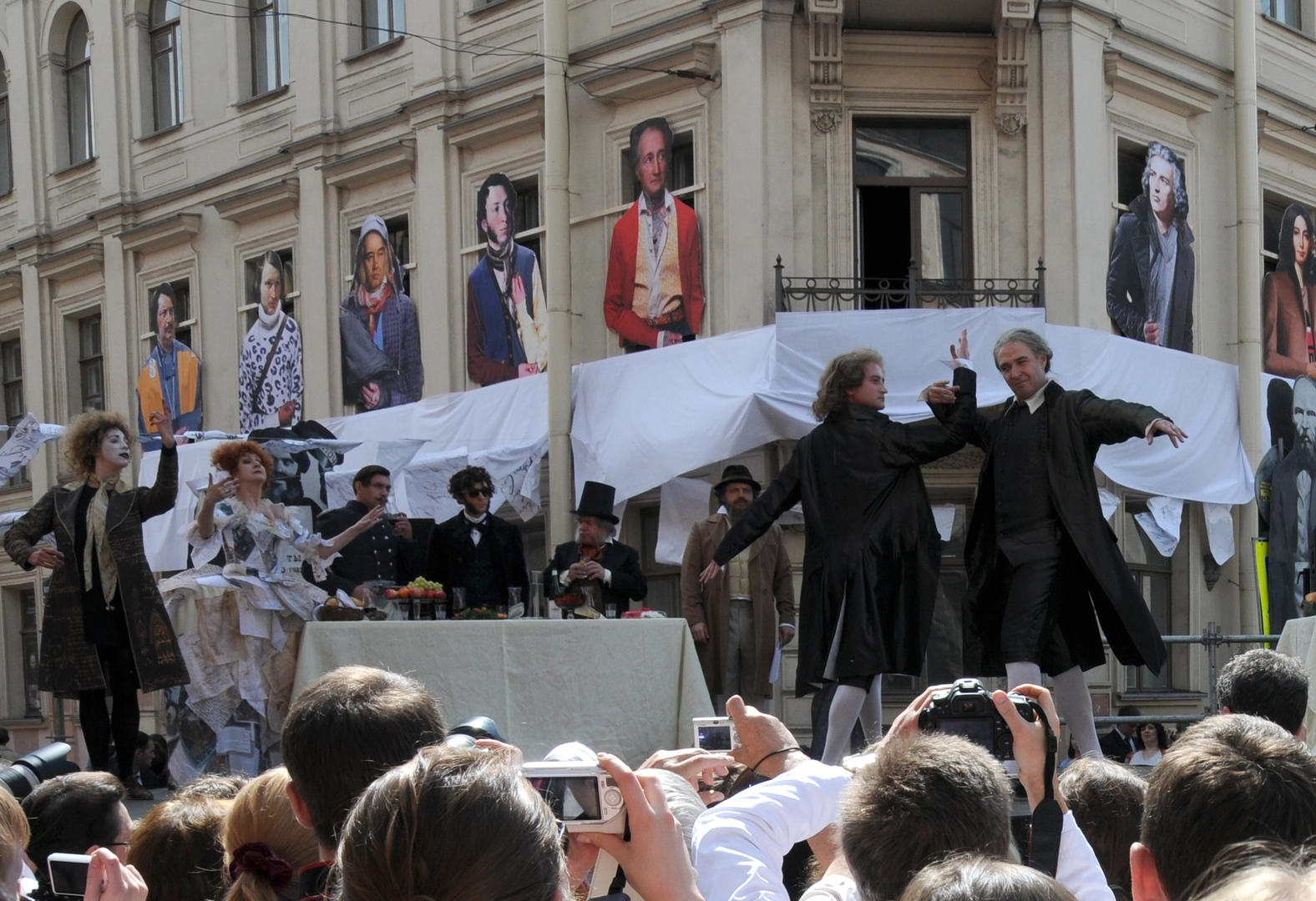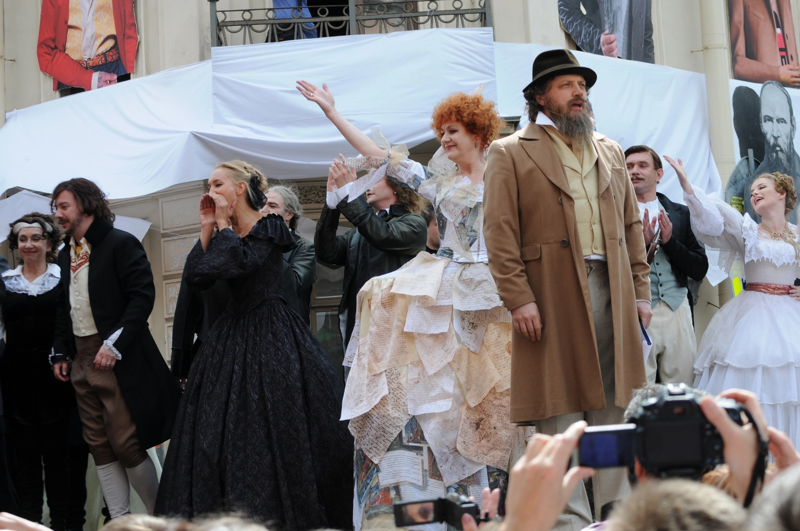 В спектакле играли ведущие актеры петербургских театров. В этом году «в гости к Достоевскому» пришла Мировая литература в виде дамы-аллегории и великие мировые классики: А.С.Пушкин, М.Ю.Лермонтов, Н.В. Гоголь, И.А.Крылов, Жорж Санд, Вильям Шекспир, О.Бальзак, Гёте и Шиллер. «Пушкин» прочитал «Скупого рыцаря» в стиле этнохаус, «баснописец Крылов» спел «Город золотой». Ожили и герои романов Достоевкого. Было много зажигательной музыки и танцев. На прощание «сам» Ф.М.Достоевский пригласил всех в следующем году собраться на этом же месте и обещал, что будет также весело.