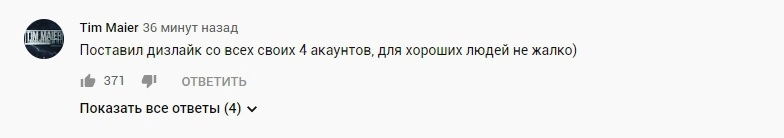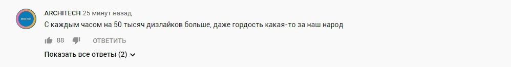 Уточняется, что предыдущий рекорд по количеству «пальцев вниз» установил рэпер Фейс со своим хитом «Я роняю Запад» — он набрал более 650 тысяч дизлайков. Вскоре клип и вовсе был удален с YouTube.