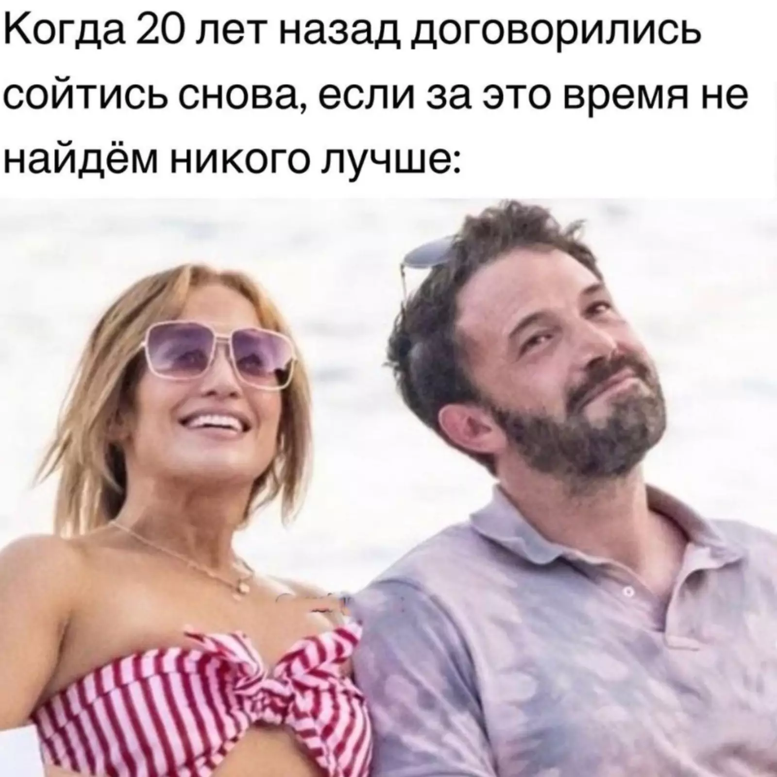 Соцсети буквально взорвала новость об отношениях Аффлека и Лопес. Почти сразу «Беннифер» стали героями журнальных обложек и вирусных мемов, в которых себя точно узнают те, кто возвращался к бывшим. Самые забавные шутки и приколы можете найти, пролистав ниже.