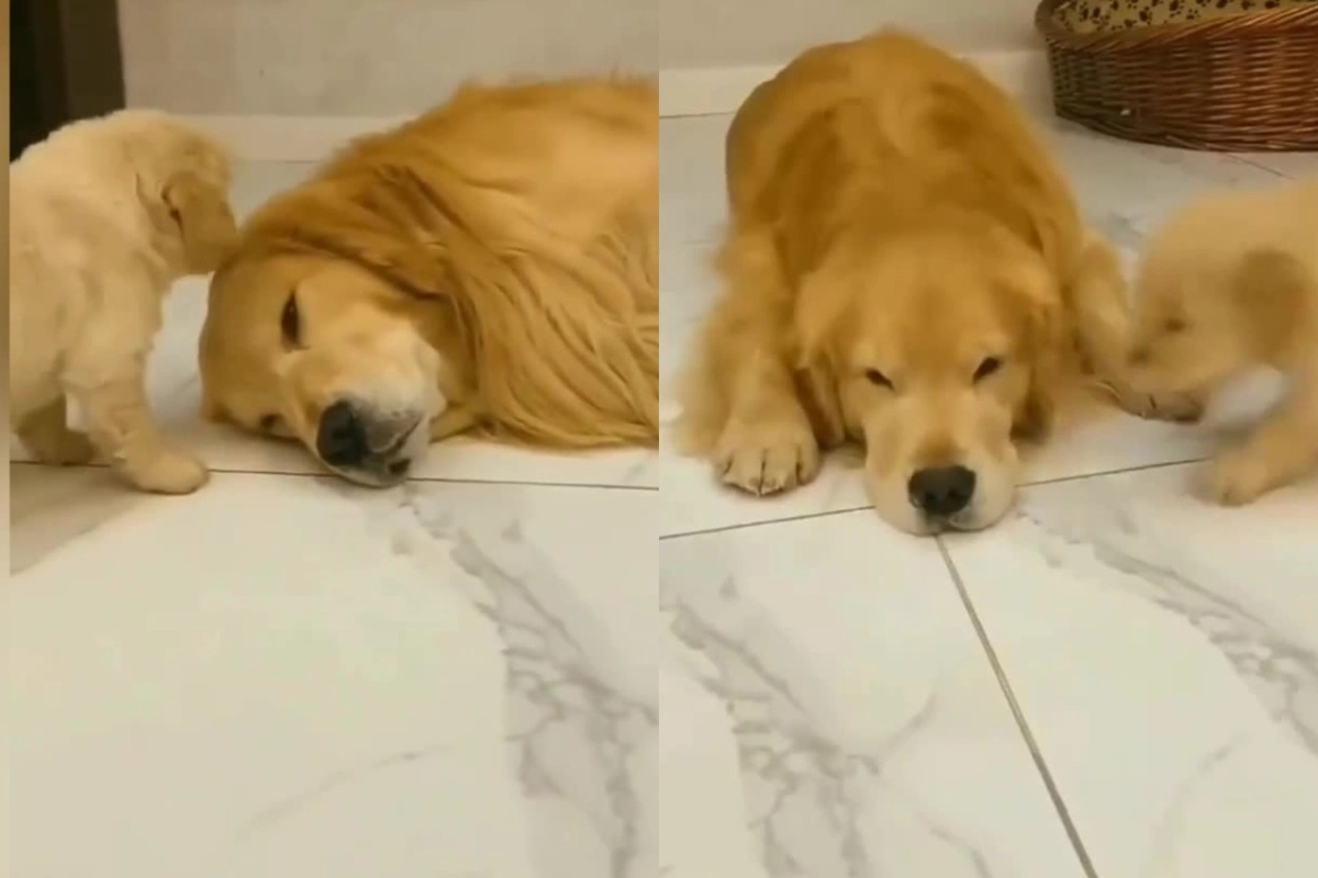Когда оставили с детьми: уставший от щенков папа-ретривер попал на видео