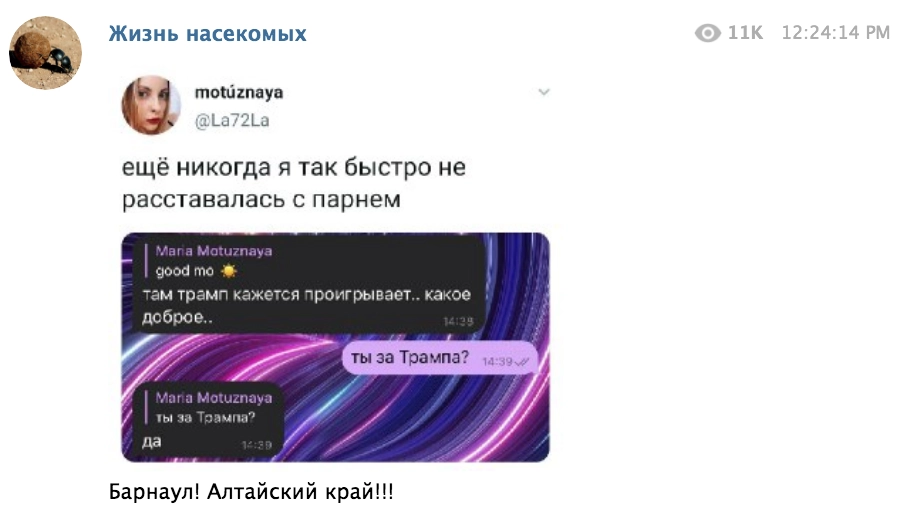 Для происходящего в российских соцсетях в разгар выборов в США придумали емкий термин — «барнаулинг». Согласно коллективному мнению пользователей, мем про Барнаул, Алтайский край применим к ситуациям, когда людей «беспокоят проблемы первого мира и при этом они живут в жопе мира».