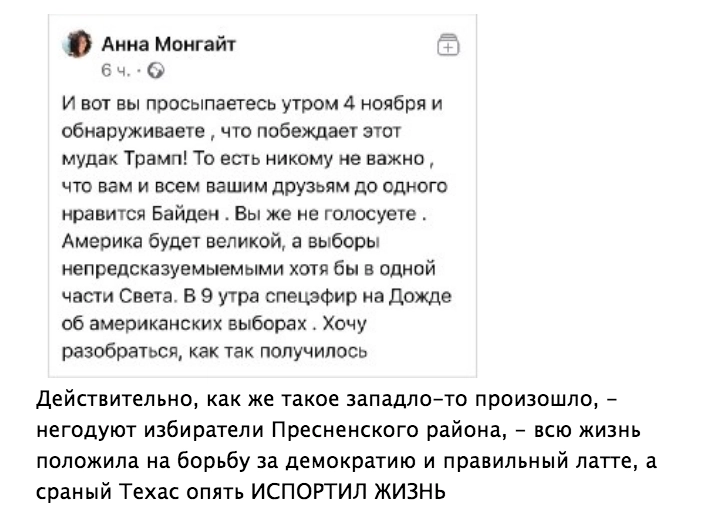 Байден, точнее, кто стоит за Байденом, все-таки вырывают победу у республиканцев. Как и предполагалось ранее, демократы ожидают, что окончательную победу принесет им голосование по почте, которое вернет им Пенсильванию, Северную Каролину и даже Джорджию, как уже вернуло Висконсин и Мичиган. По правде говоря, все это выглядит не слишком убедительно, но юридически — все сделано так, что сложно подкопаться. В этот раз меня возмущали все те эксперты, которые кричали, что они точно знают, точно знают, что непременно непременно победит такой то. Если 2020 год что-то похоронил, так это саму веру в неангажированную экспертизу, все исходили только, исключительно из своих партийных пристрастий. Пропаганда и аналитика слились в одно целое до полной неразличимости.