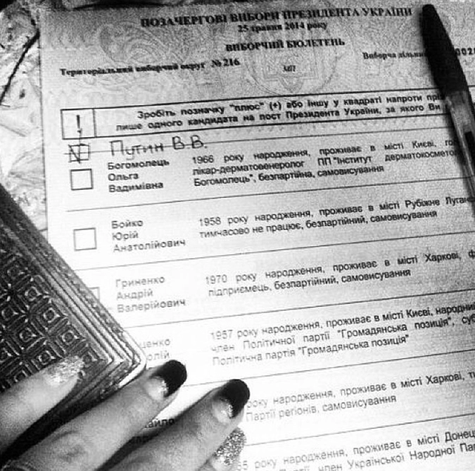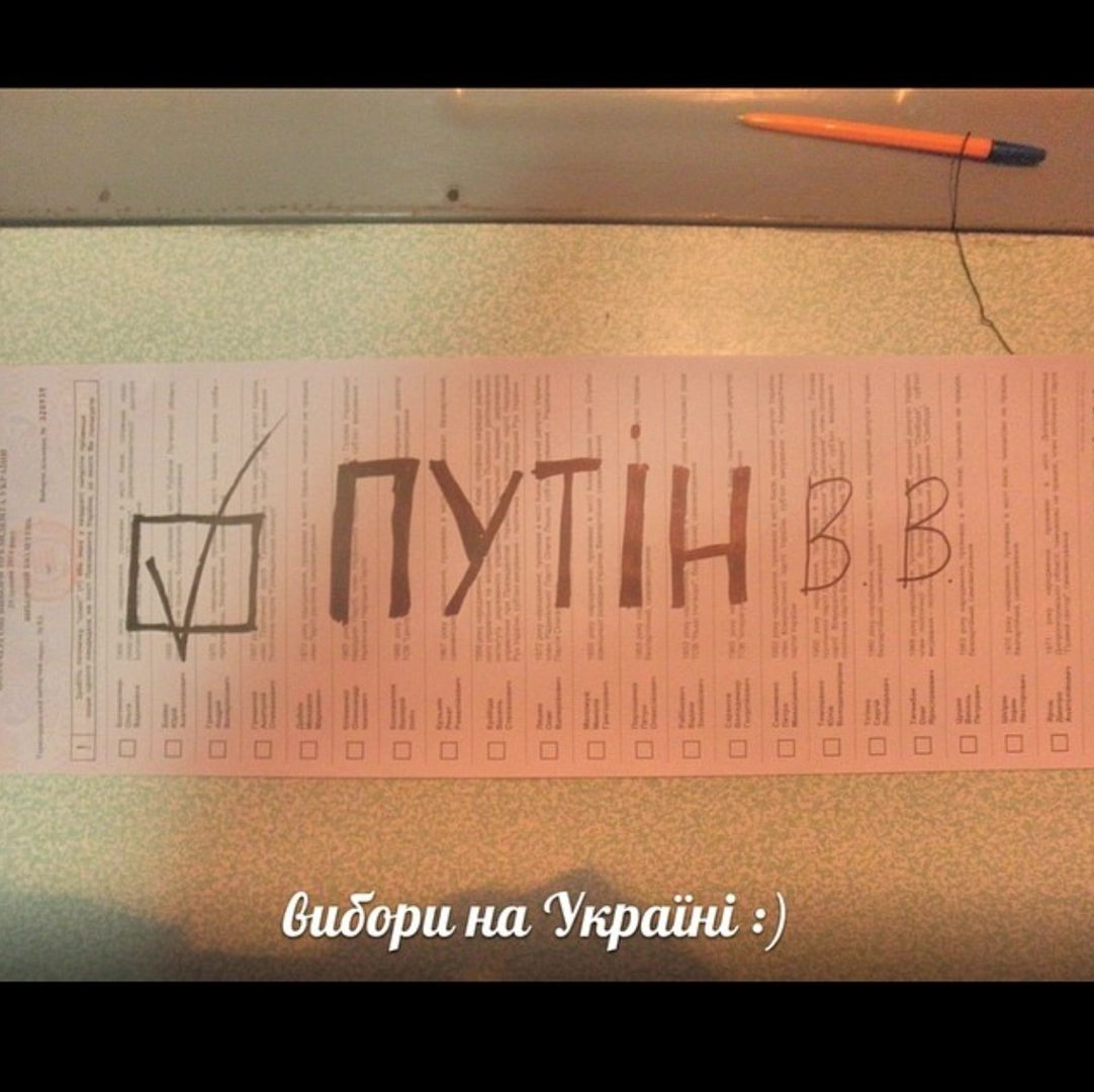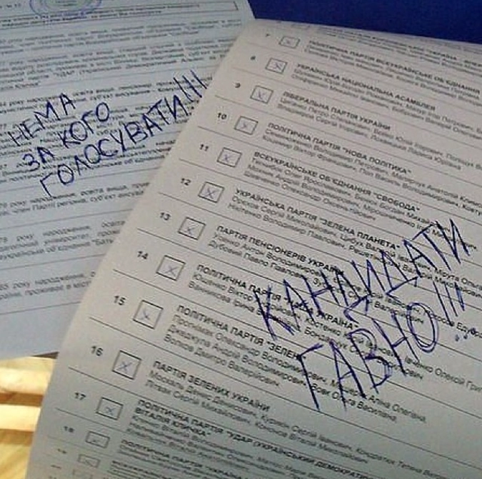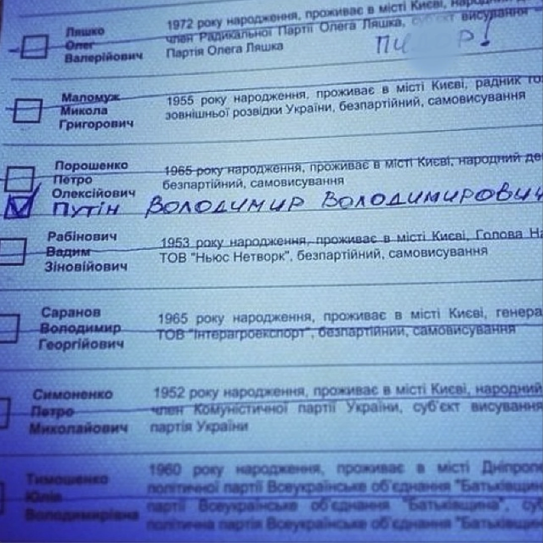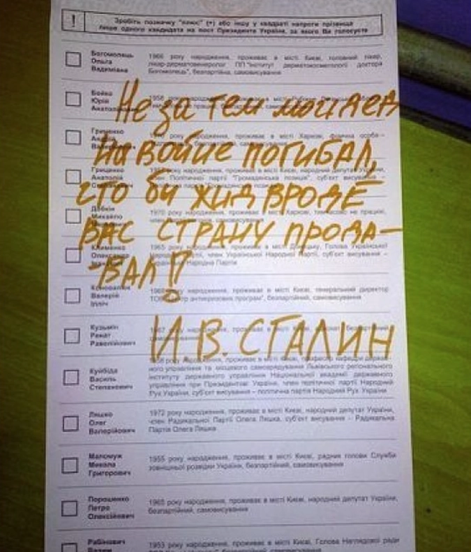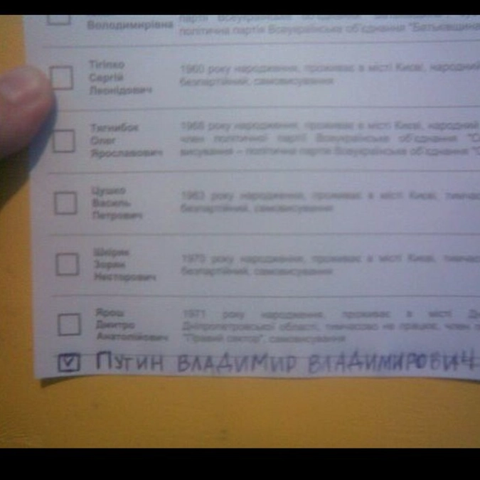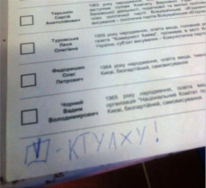 Пока в Киеве делают громкие заявления о высокой явке на избирательные участки для голосования на выборах президента, граждане Украины, возмущенные списком фамилий кандидатов, повсеместно дописывают в бюллетени свои собственные варианты. Среди «предлагаемых» кандидатов: Владимир Путин, Рамзан Кадыров, Иосиф Сталин, Дарт Вейдер и даже Ктулху.